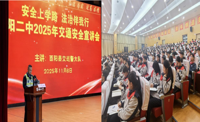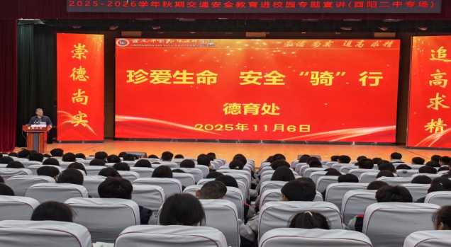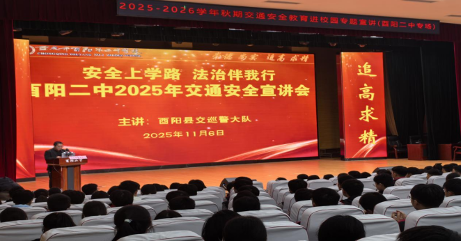 为深入贯彻落实道路交通安全法律法规,切实增强青少年学生交通安全意识与自我防护能力,有效防范化解校园周边摩电出行安全风险,保障学生上下学途中生命财产安全,营造安全、畅通、文明的道路交通环境,11 月 6 日,酉阳二中隆重举办 “安全上学路,法治伴我行”2025 年交通安全宣讲会。酉阳县交管大队中队长熊星受邀担任主讲嘉宾,学校工会主席吴小华、德育处主任赵洪明、德育处副主任申佳乐、李鸿飞、高一年级组到场参会。