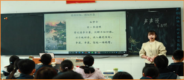 为深化学生对“愁”的理解,简老师适时引入李清照晚年“国破家亡、流离失所”的人生经历,引导学生将词句与词人的“丧夫之痛、孀居之哀、亡国之恨”相联系,使“怎一个愁字了得”的慨叹更具历史厚度与情感感染力。课程尾声,她以“国家不幸诗家幸,赋到沧桑句便工”作为总结,并带领学生齐诵全词,在朗朗书声中致敬词人坚韧孤傲的灵魂,实现情感共鸣与文化传承的双重目标。