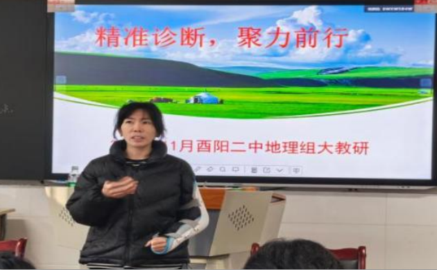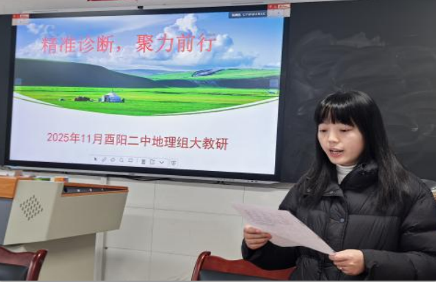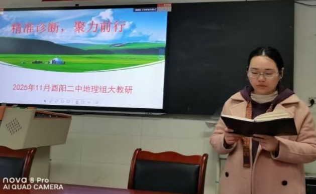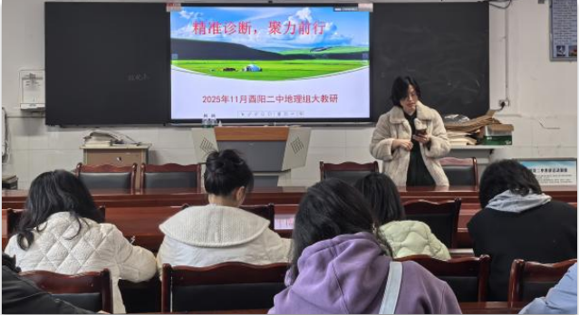 李永芳老师全面梳理了教研组上半期完成的系列工作:从地理专用教室挂牌与标本购置、知行社社团成立,到成渝地区教研交流、新教师座谈会、地理摄影大赛、参观气象站等,活动多样,成效显著。展望未来,李老师提出将着力推动教学论文撰写、举办自主命题大赛、系统编写校本课程,并特别强调校本课程开发应注重实践性、可操作性及安全保障。他感慨道,地理组是一个幸福、团结、奋进、奉献的集体,正是这种精神底色,支撑着团队不断前行,成绩节节攀升。