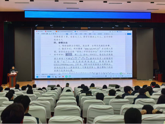 会议伊始,体艺卫处主任田文对《酉阳二中第六十九届田径运动会竞赛规程》作了全面解读。他详细介绍了运动会的宗旨、项目设置、参赛办法、录取名次及奖励办法等核心内容,并强调田径运动会是全校师生展示活力、锤炼意志、弘扬体育精神的重要平台。他要求学生干部准确把握规程内容,积极动员班级同学参与,确保信息传达到位。