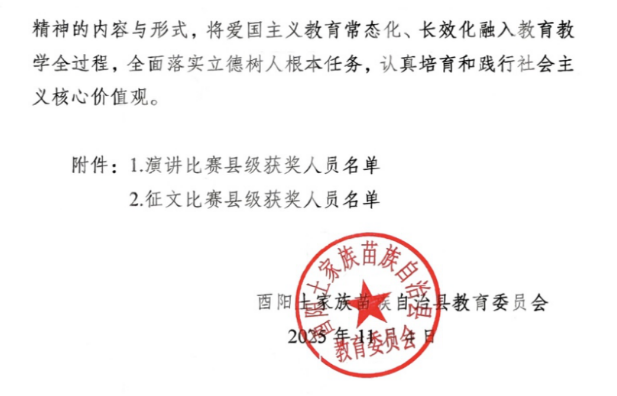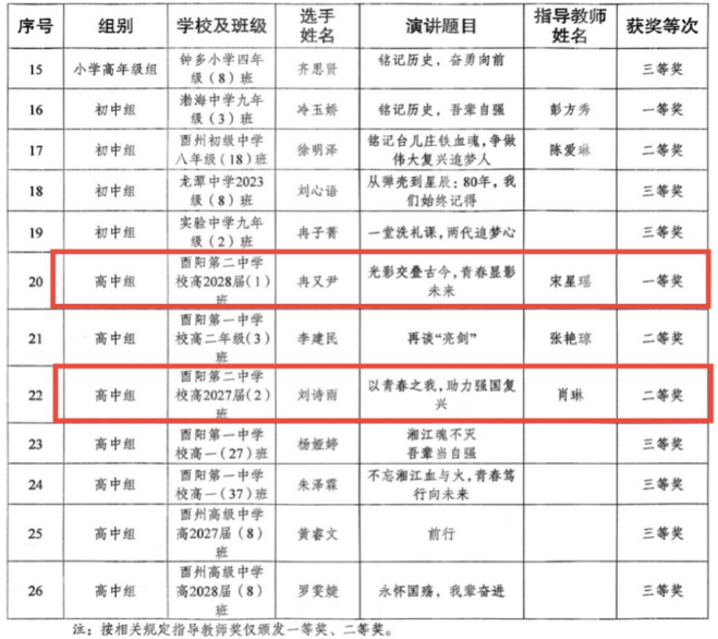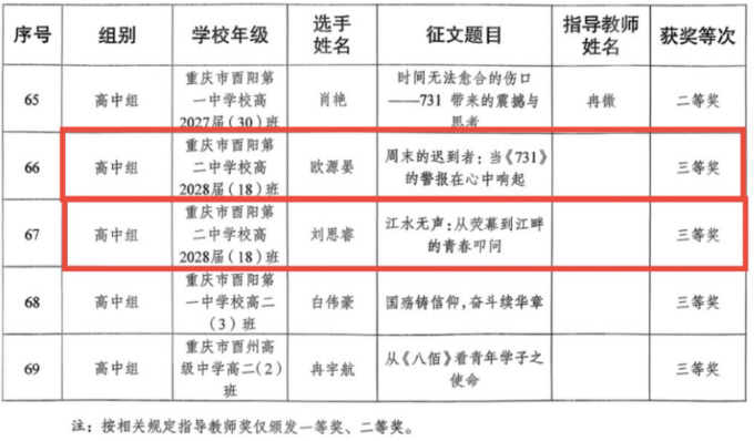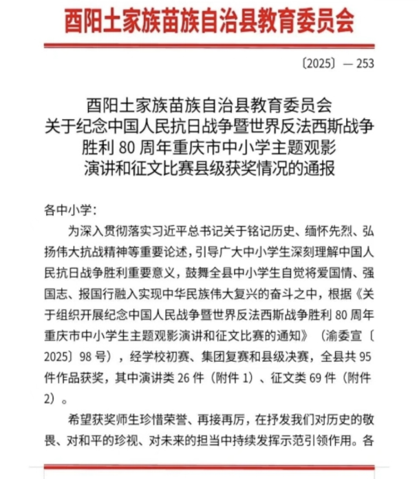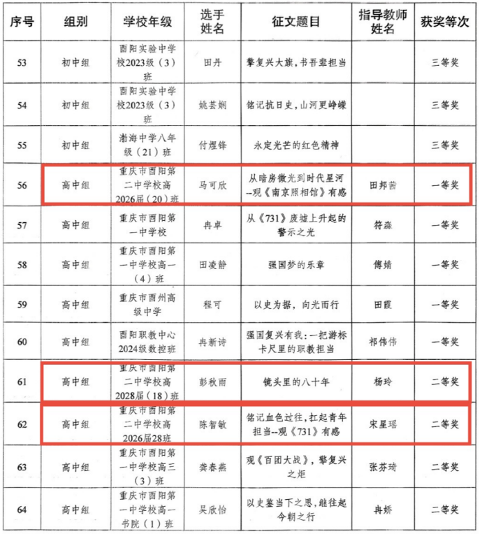 为深入贯彻落实习近平总书记关于铭记历史、缅怀先烈、弘扬伟大抗战精神等重要论述,引导广大中小学生深刻理解中国人民抗日战争胜利的重要意义,中共重庆市委宣传部、市教委等单位联合组织了以“强国复兴有我”为主题的全市中小学生主题观影演讲和征文比赛。近日,县级获奖情况正式公布,重庆市酉阳第二中学校学子表现突出,荣获多项大奖。