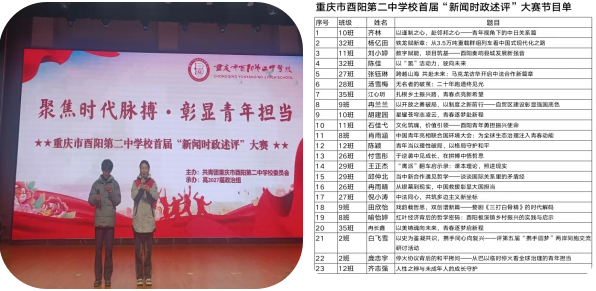 比赛过程紧张有序,精彩纷呈。23位选手围绕大赛主题,从多个维度展开了深入述评:既有对中日关系、中法合作、巴以局势等国际议题的理性剖析,也有对中国式现代化、自贸区建设、乡村振兴等国家战略与本土实践的生动阐释;既关注“氢”洁能源、航天梦想等科技前沿,也探讨文化铸魂、美育育人、哲学思辨等人文命题。选手们紧扣所学“经济生活”“政治生活”“文化生活”“生活与哲学”等模块知识,观点鲜明、逻辑清晰、论据有力,展现了出色的理论运用能力和独立思考精神。在6分钟的脱稿讲述中,他们语言流畅,情感充沛,辅以制作精良、图文并茂的PPT,展现了酉阳二中学子自信从容的风采和心系家国的担当。