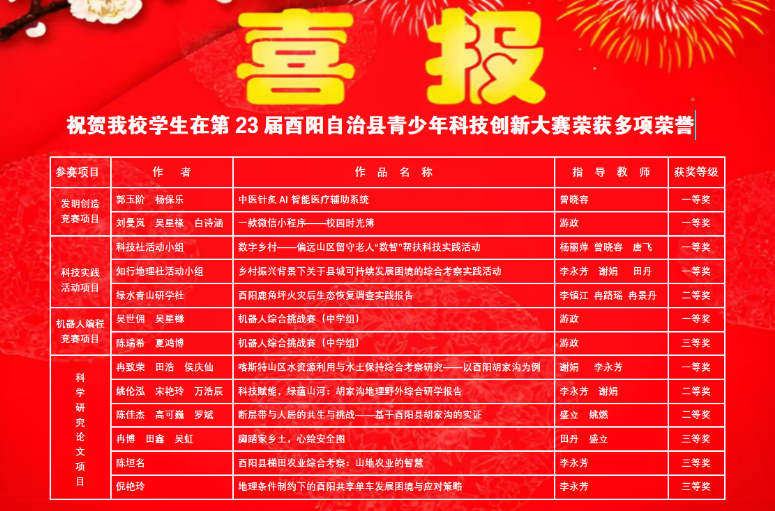 科创赋能促成长 示范引领谱新篇 —酉阳二中斩获第23届县青少年科技创新大赛多项荣誉 阅读:9