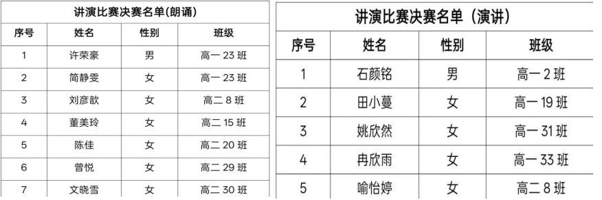 经过激烈角逐,几位评委从内容主题、语言表达、情感感染力、舞台表现等方面进行了公平、公正、专业的综合评分,终评选结果如下:朗诵组一等奖选手为高2027届29班曾悦同学,演讲组一等奖获得者为高2028届31班 姚欣然同学 ,其余选手分获二、三等奖,选手们均展现出较高的语言素养与精神风貌。